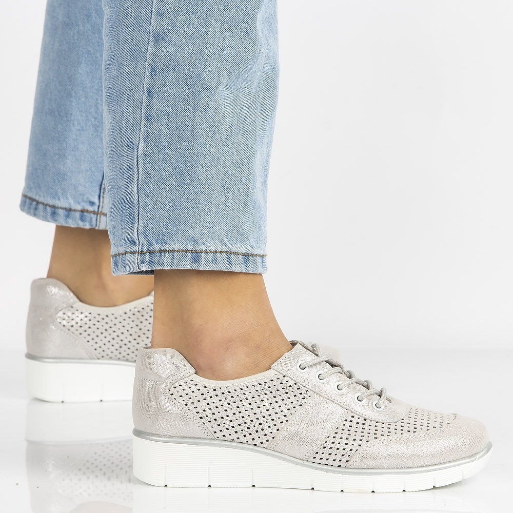 Die Kunststoffsohle überzeugt durch ihre außergewöhnliche Leichtigkeit, was diese Schuhe zu einer idealen Lösung für alltägliche Spaziergänge oder das Ausgehen mit Freunden macht. Die Schafthöhe von 6 cm sorgt für dezente Eleganz und die weiße Farbe der Sohle bildet einen schönen Kontrast zum dekorativen Silberfinish.
