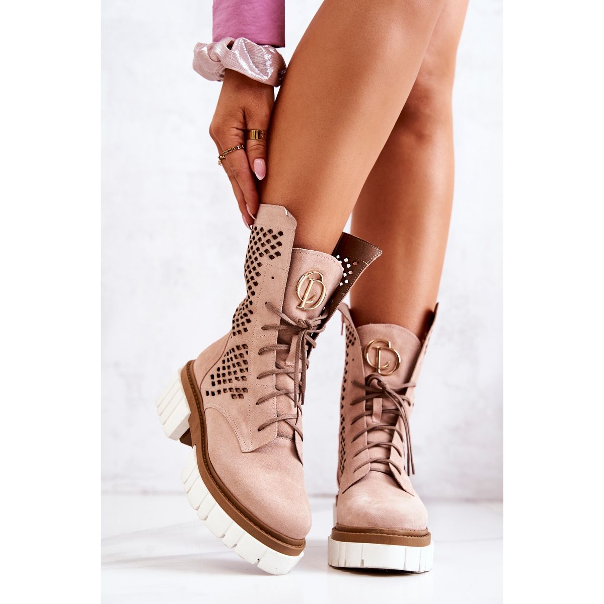 Nicole -Stiefel werden mit einer modischen, robusten Tasche von Arbeitern mit einer zarten, zarten, nackten rosa Farbe kombiniert. Dies ist ein universelles Modell, das den alltäglichen und eleganteren Stilisierungen Charakter verleiht und gleichzeitig dank einer weichen Innensohle und einer praktischen Befestigung Komfort bietet.