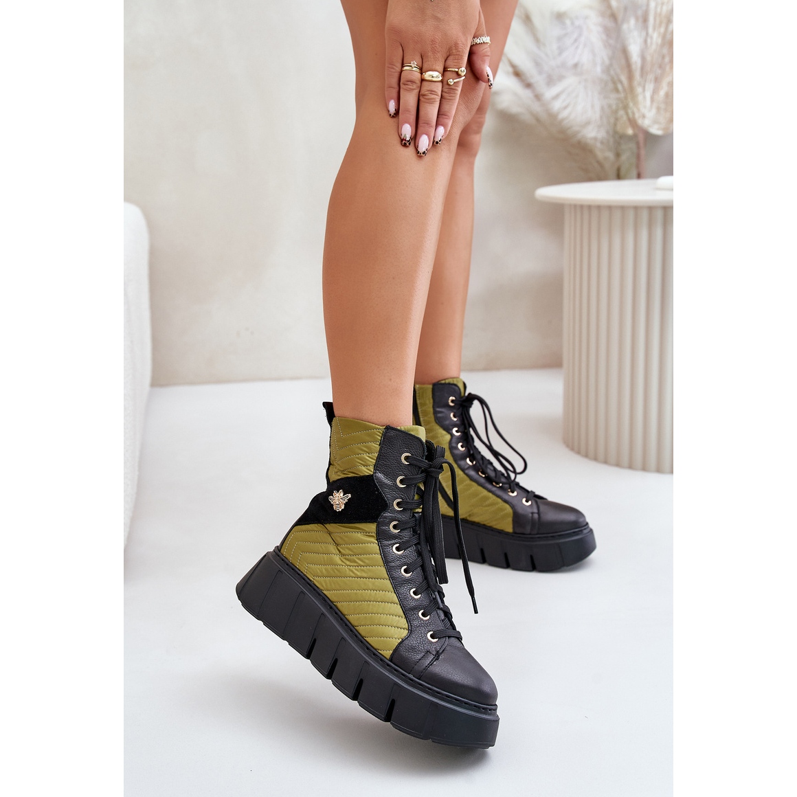 Stiefel auf einer soliden Plattform mit einer Höhe von 4,5 cm kombinieren die Funktionalität mit modischem Stil. Dank der Verschluss und Schnürung von Reißverschluss können Sie sich auf eine perfekte Passform sowie auf die Leichtigkeit des Anziehens verlassen. Das Innere der mit einer Schuhedecke isolierten Schuhe macht sie für kühlere Tage eine gute Wahl und bietet auch während längerer Tragen Komfort.