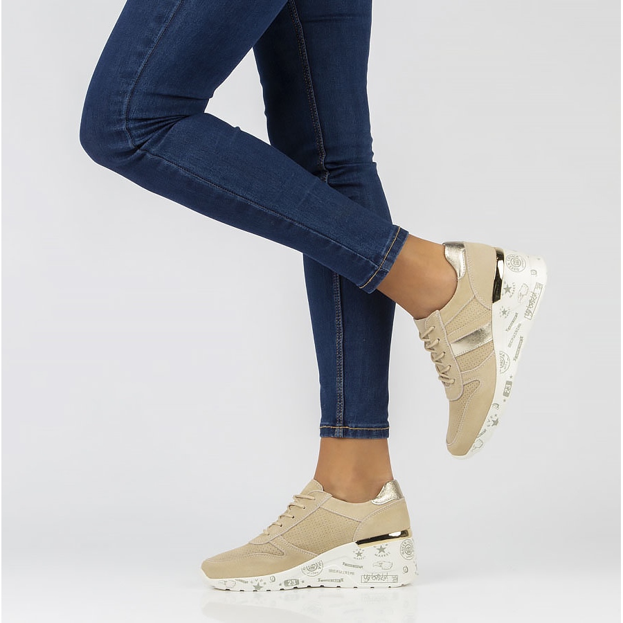 Durch ihre universelle beige Farbe passen sie perfekt zu einer Vielzahl von Stilrichtungen, von lässig bis elegant. Ein 2 cm hohes Plateau und ein 5,5 cm hoher Keil verlängern nicht nur optisch die Silhouette, sondern sorgen auch für zusätzlichen Komfort beim Gehen.
