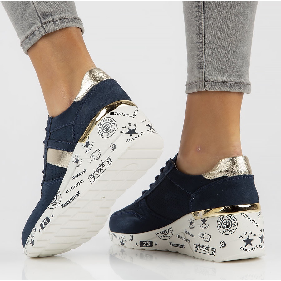 Die marineblaue Farbe mit goldenen Akzenten ist eine elegante Kombination, die zu verschiedenen Stilen passt. Der Schnürverschluss ermöglicht eine individuelle Passform und die 2 cm hohe Synthetiksohle mit 5,5 cm hohem Keilabsatz sorgt für Leichtigkeit und macht diese Sneaker praktisch und stylisch zugleich.