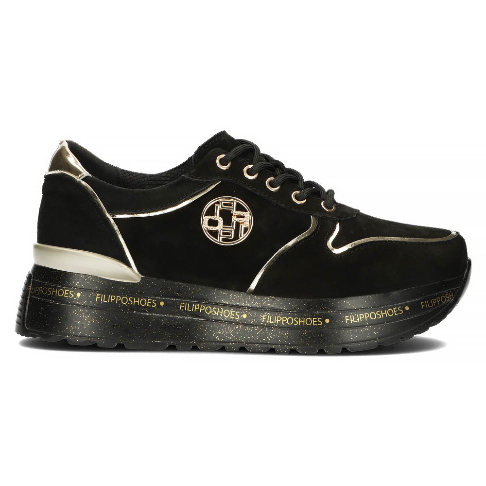 Entdecken Sie das neueste Modell der Ledersneaker Filippo DP3558/22 Bk in einer eleganten Kombination aus Schwarz und Gold. Diese einzigartigen Schuhe, die speziell für Frauen entwickelt wurden, vereinen Stil, Komfort und einen sportlichen Charakter und eignen sich perfekt für alltägliche Ausflüge und Aktivitäten.