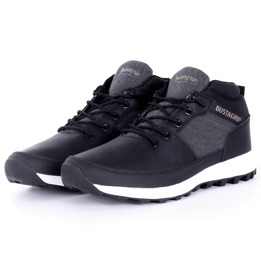 Herren -Leder -Turnschuhe Trax Bustagrip - Schwarz, zeitlos und vielseitig. Die Kombination aus natürliches Leder mit einem komfortablen, isolierten Futter macht das Modell im Herbst und Winter perfekt, da alltägliche, bequeme Knöchelschuhe. Universelle, schwarze Farbe und einfacher Schnitt ohne Muster entsprechen lässige Stilisierungen und weniger formale Ausgänge.