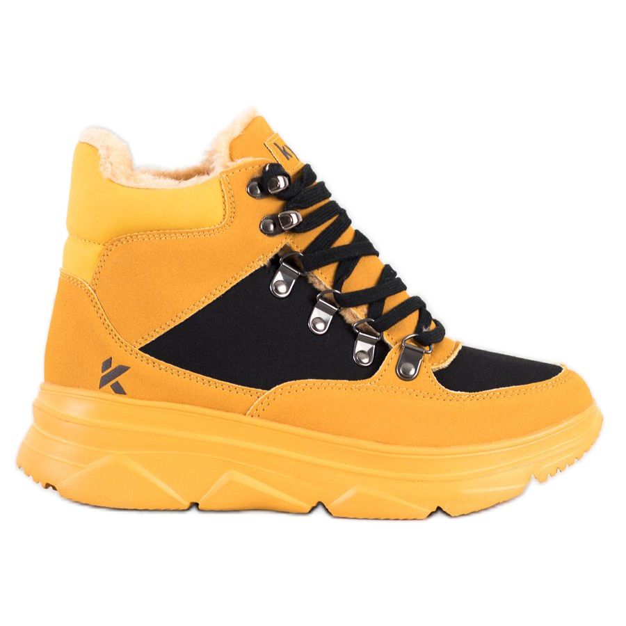 Hier ist das perfekte Schuhwerk für kältere Tage – leichte, sportliche Plateaustiefel von Kylie. Sie zeichnen sich durch eine modische Farbkombination aus Schwarz und Gelb aus, die Aufmerksamkeit erregt und perfekt zu den neuesten Trends passt.