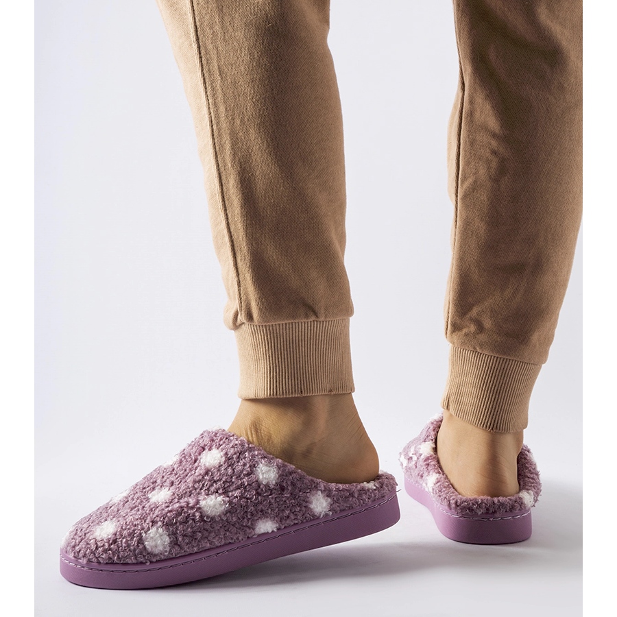 Details: Lila warme Hausschuhe mit weißen Punkten violett
