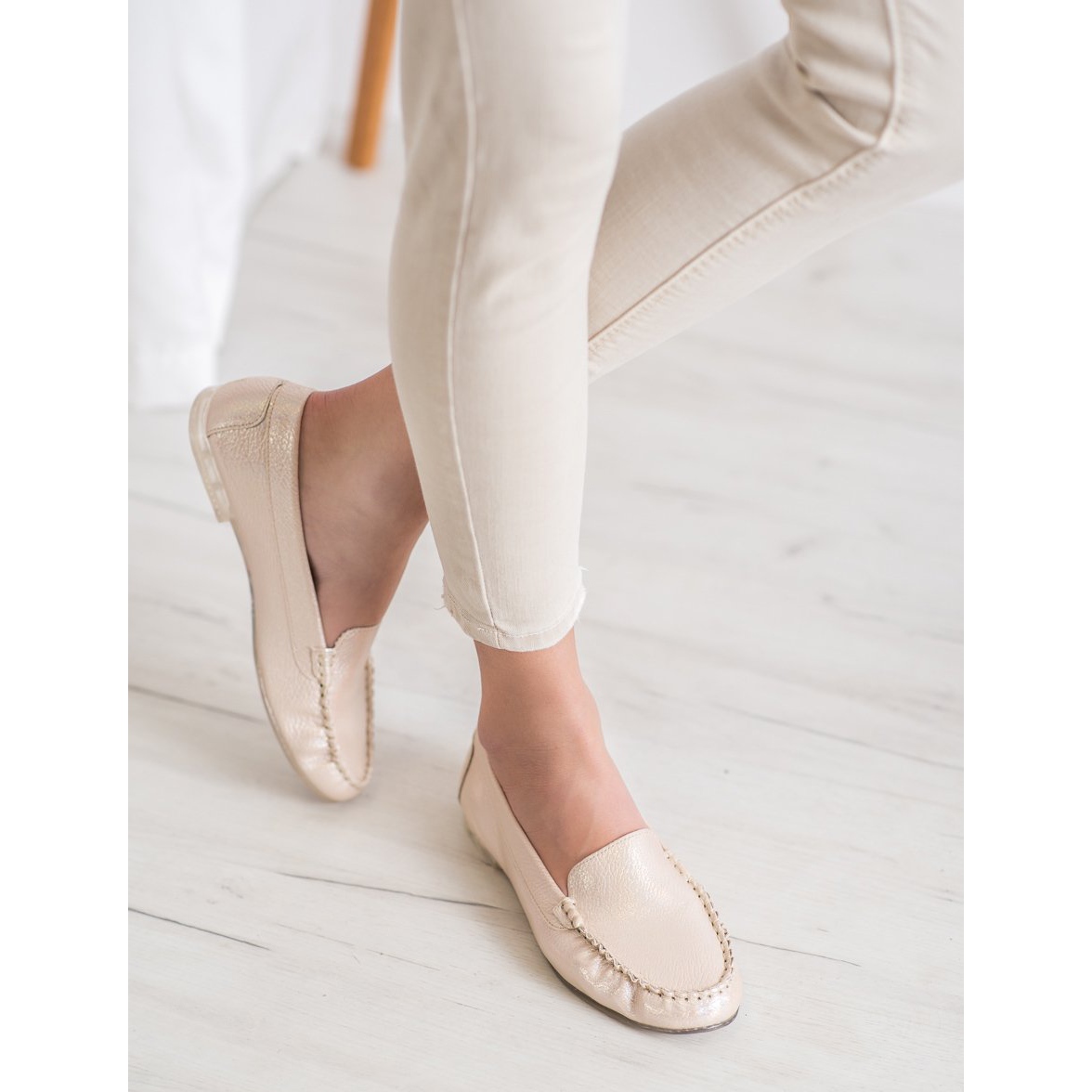 Die Mokassins haben abgerundete Zehen, die mit dezenten Nähten verziert sind, was ihnen einen klassischen Charakter verleiht. Dank eingearbeitetem, weichem Absatz und einer flachen Kunststoffsohle eignen sich diese Schuhe perfekt für den Alltag und für besondere Anlässe.