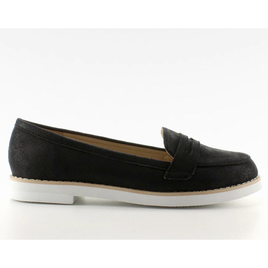 Pastellfarbene Damenmokassins 7112 Black – Schwarz mit dezentem, schillerndem Glanz, der klassischen Stil mit einem leichten, modernen Akzent verbindet. Das formschöne Design auf einer weißen, sportlichen Sohle lässt die Schuhe frisch und stilvoll aussehen und ist gleichzeitig perfekt für den täglichen Gebrauch.