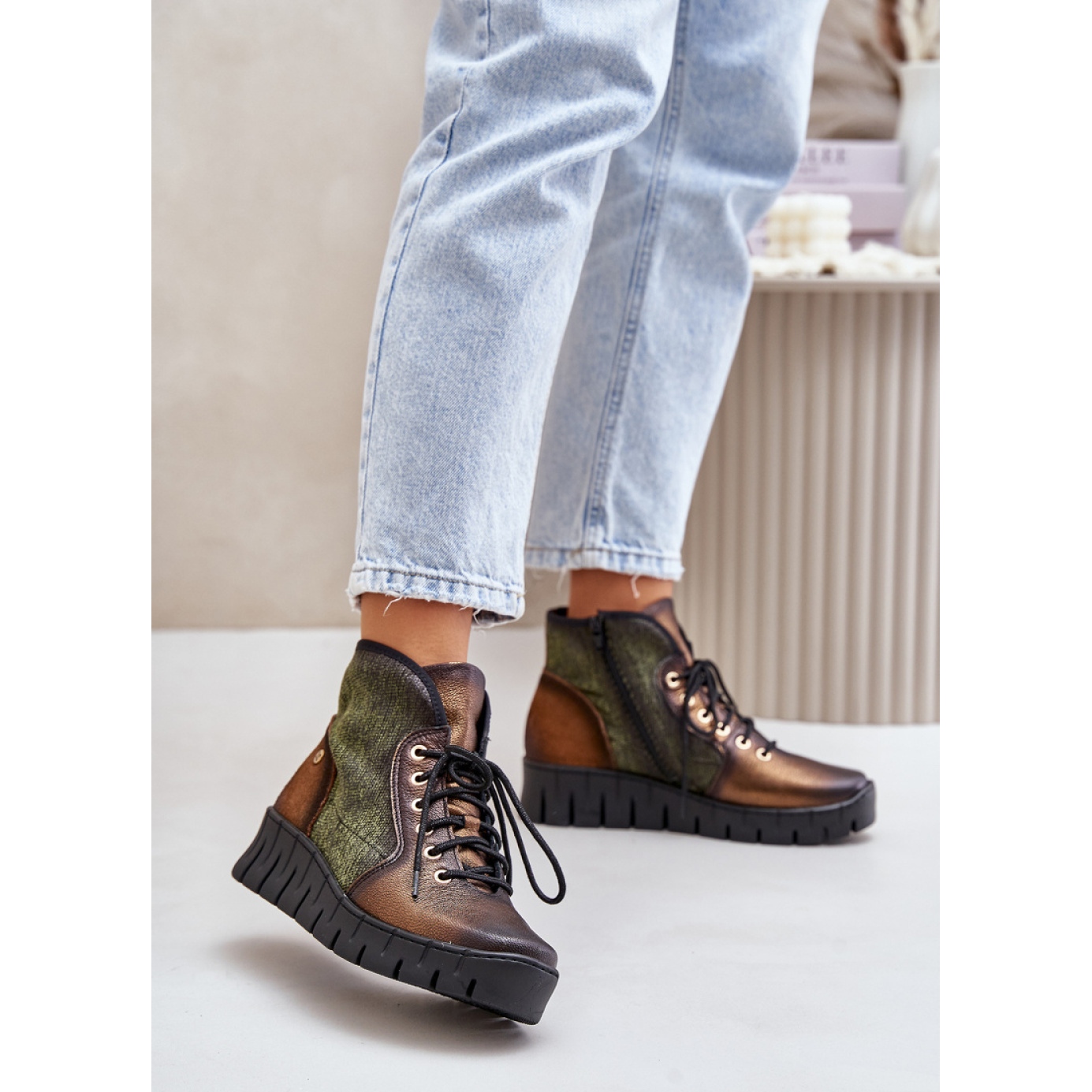 Übertragen Sie Ihre Herbststilisierungen dank Maciejka 06702-09 Stiefel in Grün und Gold auf ein höheres Niveau. Diese einzigartigen Stiefel kombinieren modernes Design und Komfort, was sie zur perfekten Wahl für kühlere Tage macht. Ihr 12 -cm -Obermaterial, das auf einer Plattform und 5 cm hohe Keile eingestellt ist, sorgt für Stabilität und Komfort beim Tragen.