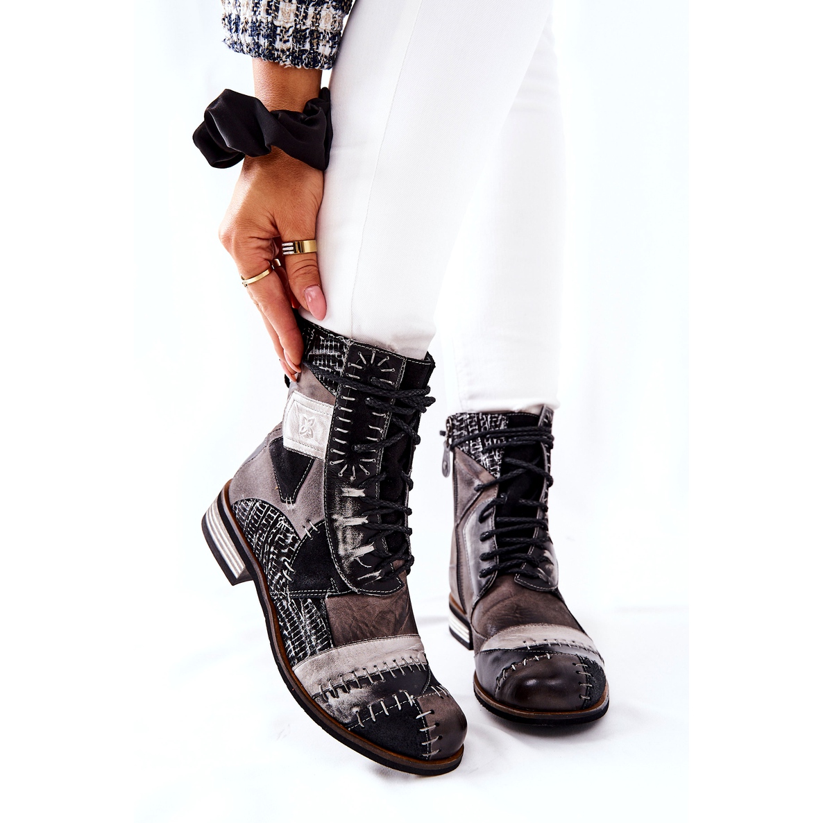 Einer der Hauptvorteile dieser Stiefel ist ihre Vielseitigkeit – sie sind eine perfekte Ergänzung zu jedem Styling, von alltäglichen Outfits bis hin zu eleganteren Outfits. Das Obermaterial des Schuhs kombiniert verschiedene Ledertöne, was ihm einen einzigartigen Charakter verleiht. Dank der Schnürung und des Reißverschlusses ist das An- und Ausziehen der Stiefel äußerst einfach und bequem.