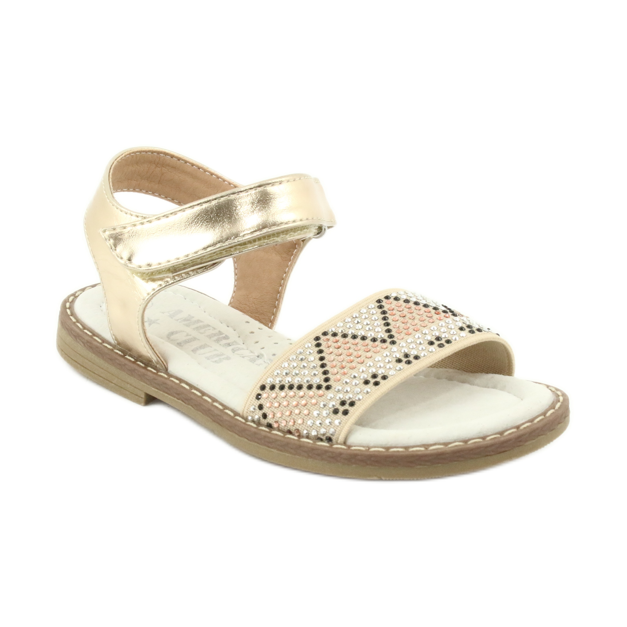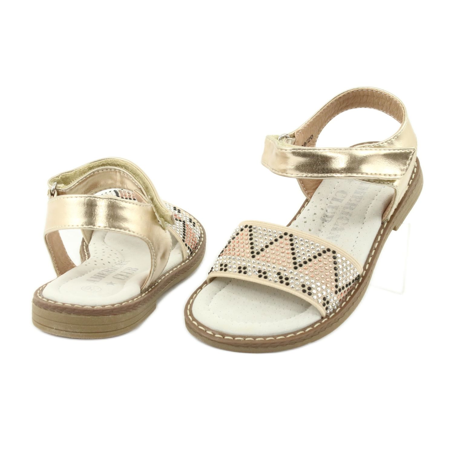 Entdecken Sie die einzigartigen Mädchensandalen in Metallic-Gold mit Pailletten von American Club GC08/20, die jedes Styling einer kleinen Prinzessin perfekt ergänzen! Diese modischen Sandalen wurden mit Blick auf Komfort und Ästhetik entworfen und kombinieren hochwertige synthetische und textile Materialien in einem auffälligen, glänzenden Finish.