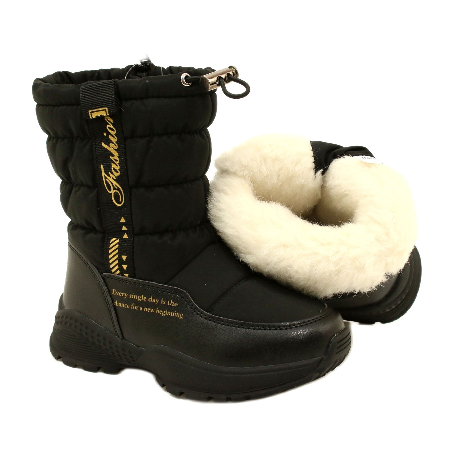 Elegante Black Snow Boots Miss Evento 22DZ23-5274 ist eine Kombination aus modischem Aussehen und Funktionalität. Sie bestehen aus einer Kombination aus ökologischem Leder und Ortalion mit einem lackierten Finish mit einem zarten goldenen Muster und schützen bei Winterbedingungen (wasserdicht) und thermischem Komfort dank der Isolierung eines weichen, dicken, dicken Fells aus natürlicher Wolle.