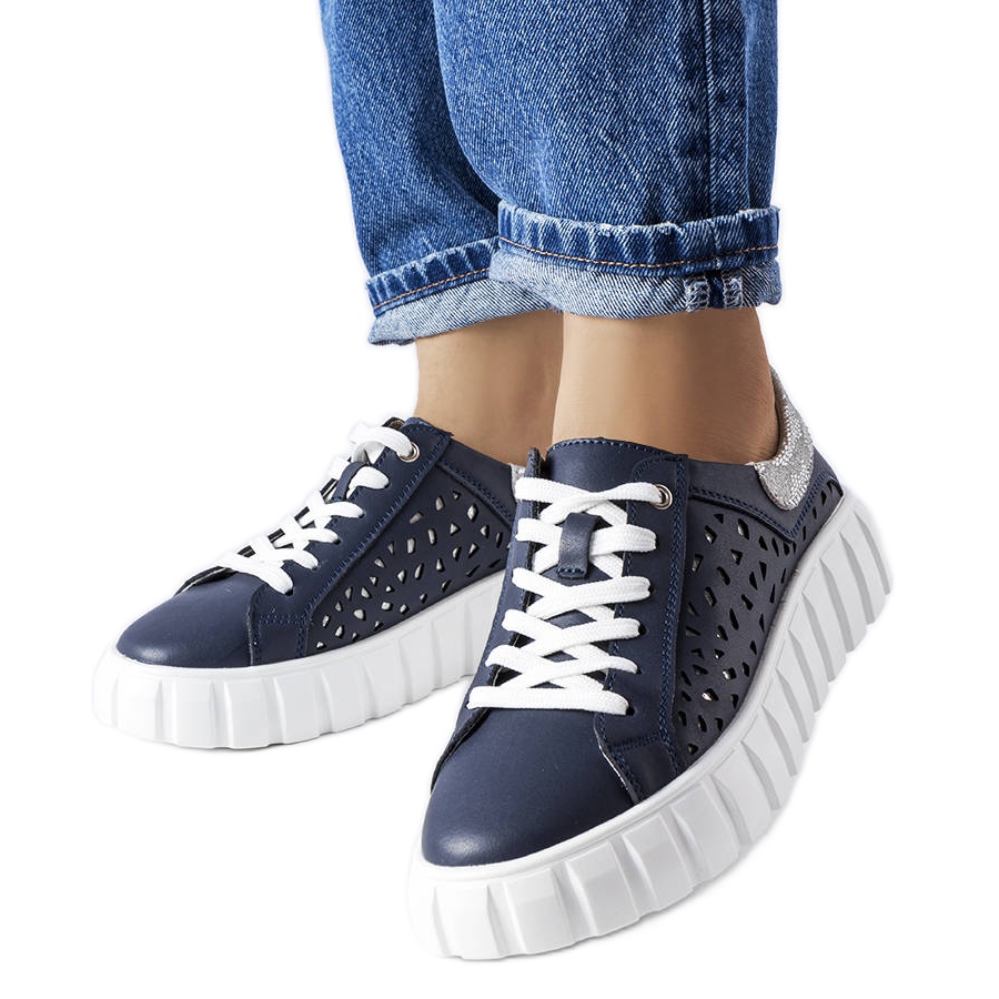 Eine elegante Kombination aus städtischer Clearance und Klassiker - dunkelblaue Turnschuhe aus glänzendem, offenem natürliches Leder mit passenden Farbfüllung und blauen Patch -Einsätzen. Auf eine klare, weiße Sohle mit vertikalen Rillen mit einer runden Nase und Schnürung für eine perfekte Passform setzen.