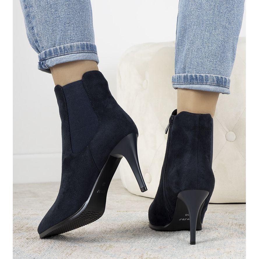 Die marineblauen Varela-Stiefeletten mit hohen Absätzen sind die perfekte Wahl für jede Frau, die ihrer Herbstgarderobe Eleganz und Stil verleihen möchte. Diese wunderschönen Schuhe sind aus hochwertigem ökologischem Wildleder gefertigt und sehen nicht nur phänomenal aus, sondern sorgen auch für Tragekomfort. Ihre dezente Spitze macht den Fuß perfekt schmaler und der hohe Stiletto-Absatz betont die Vorzüge der weiblichen Figur.
