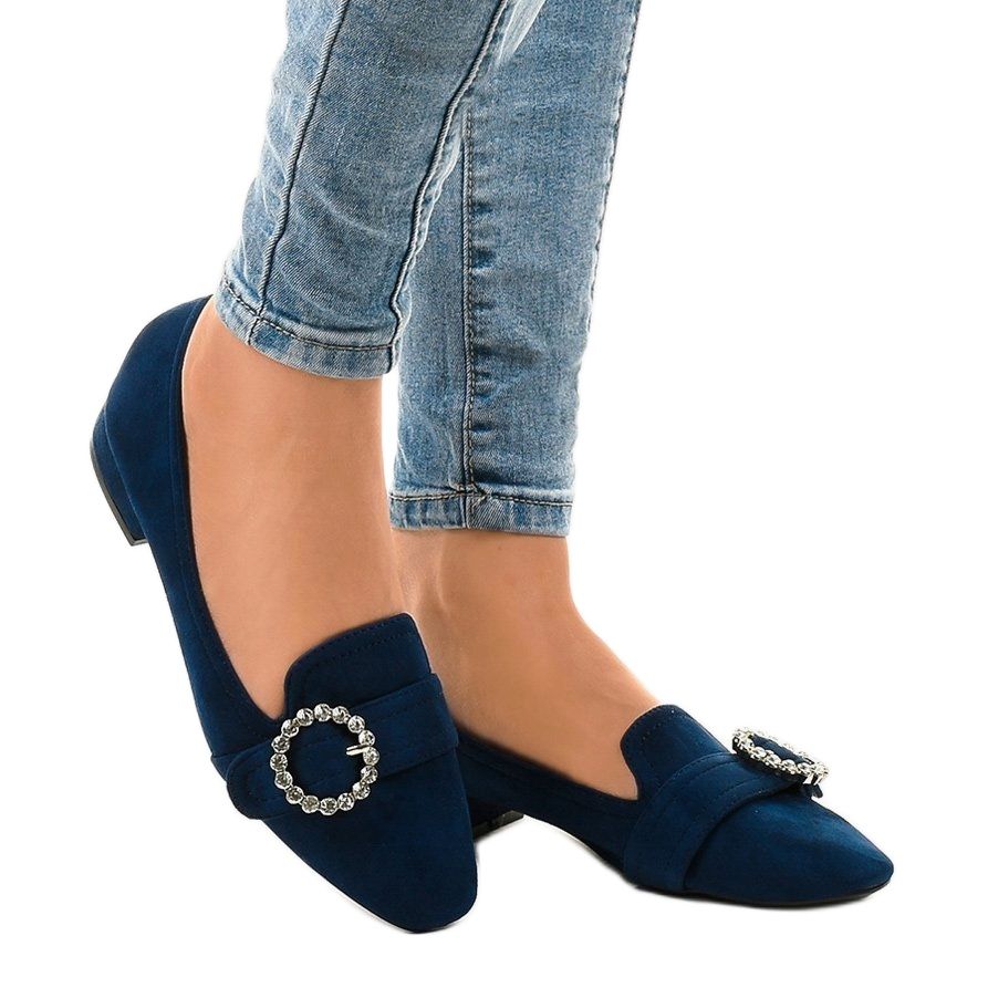 Das Innere der Schuhe besteht aus ökologischem Leder, was den Tragekomfort und die Pflege der Füße erhöht. Die marineblaue Farbe des Wildleders und die schwarze Sohle ergeben ein harmonisches Ganzes und zusätzliche Strasssteine sorgen für Glanz und Raffinesse.