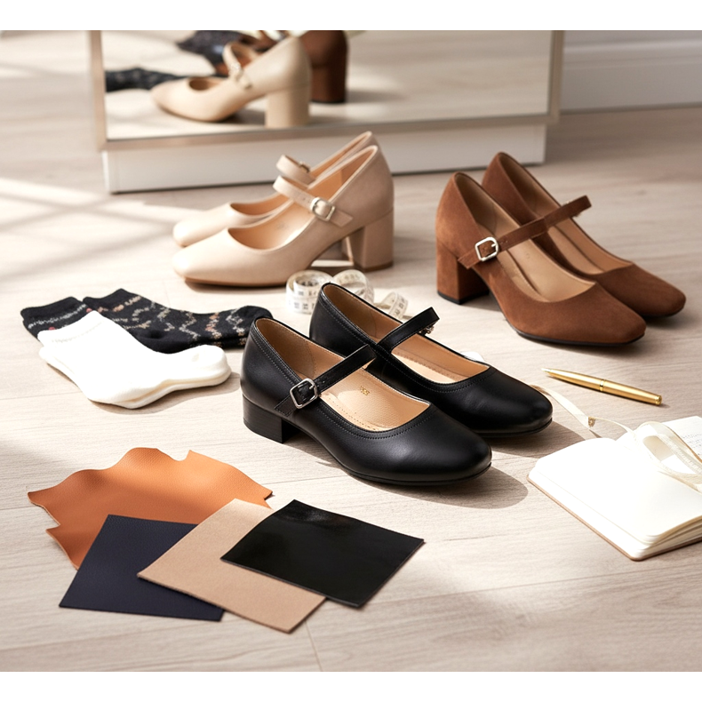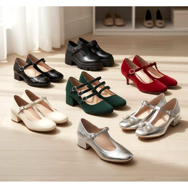 Auf dem Markt sind viele Mary-Jane-Varianten erhältlich, die sich in Absatzhöhe, Material und Stil unterscheiden.