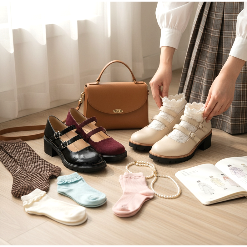 Klassische flache Mary Jane Dies ist die traditionellste Version. Abgerundete Spitze, einzelner Riemen mit Schnalle und flache Sohle. Perfekt für den alltäglichen Retro- oder Preppy-Styling.