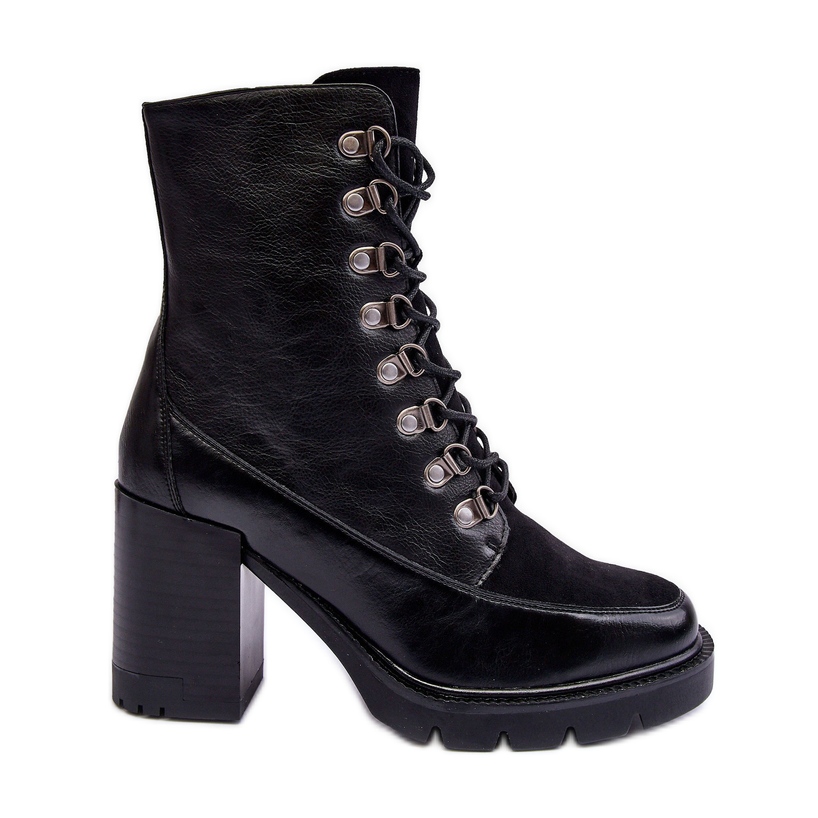 Stilvolle und praktische Stiefel ideal für die Herbst/Winter -Saison - sie kombinieren eine modische, massive Ferse mit einer stabilen Plattform und bieten einen bestimmten Schritt und einen effektiven Look. Hergestellt aus einer Kombination aus Öko -Leder und Öko -Wildleder in einer klassischen schwarzen Farbe. Mit einem Seitenschloss befestigt und zusätzlich mit Schnürung für eine bessere Passform ausgestattet. Der Innenraum isoliert mit einer Schuhedecke - warm und ankühler an kühleren Tagen.