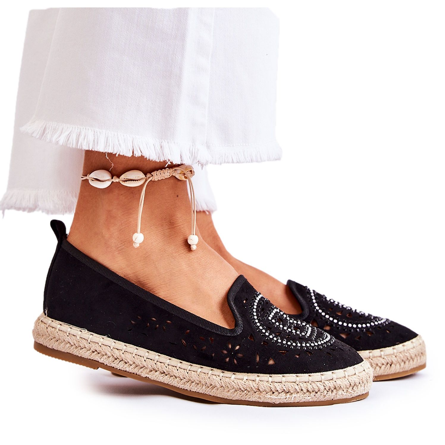 Klassische S.Barski Meredith Espadrilles kombinieren Leichtigkeit und femininer Akzent dank des offenen Arbeitsmusters und der dekorativen Zirkone. Hergestellt aus angenehmes Eco-Wasser, eingebettet in eine flache Ferse mit einer geflochtenen Jute-Plattform-ideal für viele alltägliche Stilisierungen.