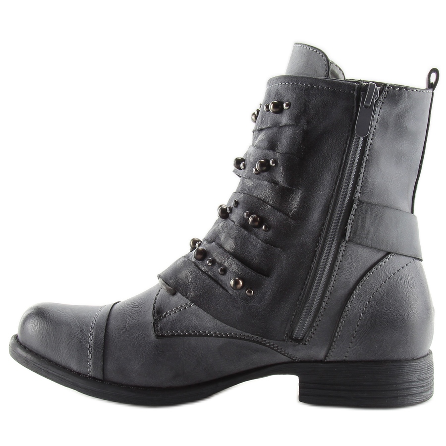 Wir präsentieren Damen-Militärstiefel in der Farbe Grau, die Stil, Komfort und Originalität vereinen. Aus hochwertigem ökologischem Leder gefertigt, bieten sie nicht nur ein attraktives Aussehen, sondern auch Langlebigkeit. Ihr charakteristisches Obermaterial mit einer auffälligen, mit Strasssteinen verzierten Lasche zieht die Blicke auf sich und verleiht jedem Styling einen einzigartigen Charakter.