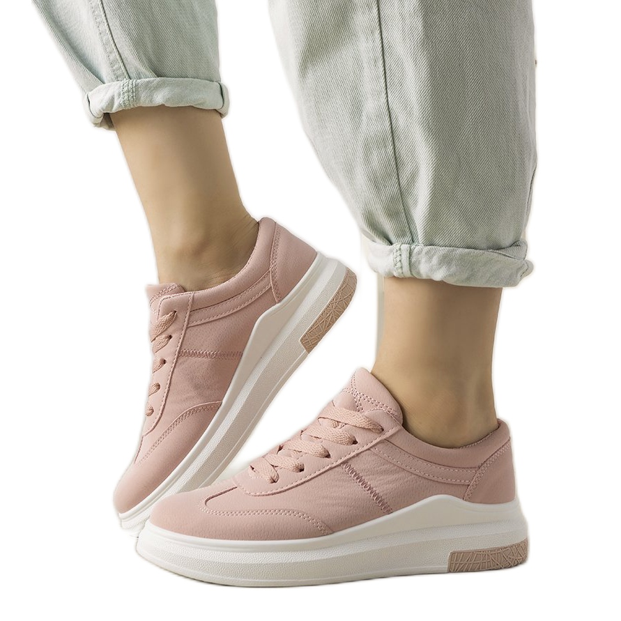 Die Sneakers bestehen aus hochwertigem ökologischem Wildleder in einem wunderschönen Puderrosa-Ton, der jedem Styling Charme verleiht. Die Kombination aus einem rosafarbenen Obermaterial und einer weißen Sohle ergibt ein harmonisches Ganzes, das sich sowohl für alltägliche als auch für elegantere Outfits eignet.
