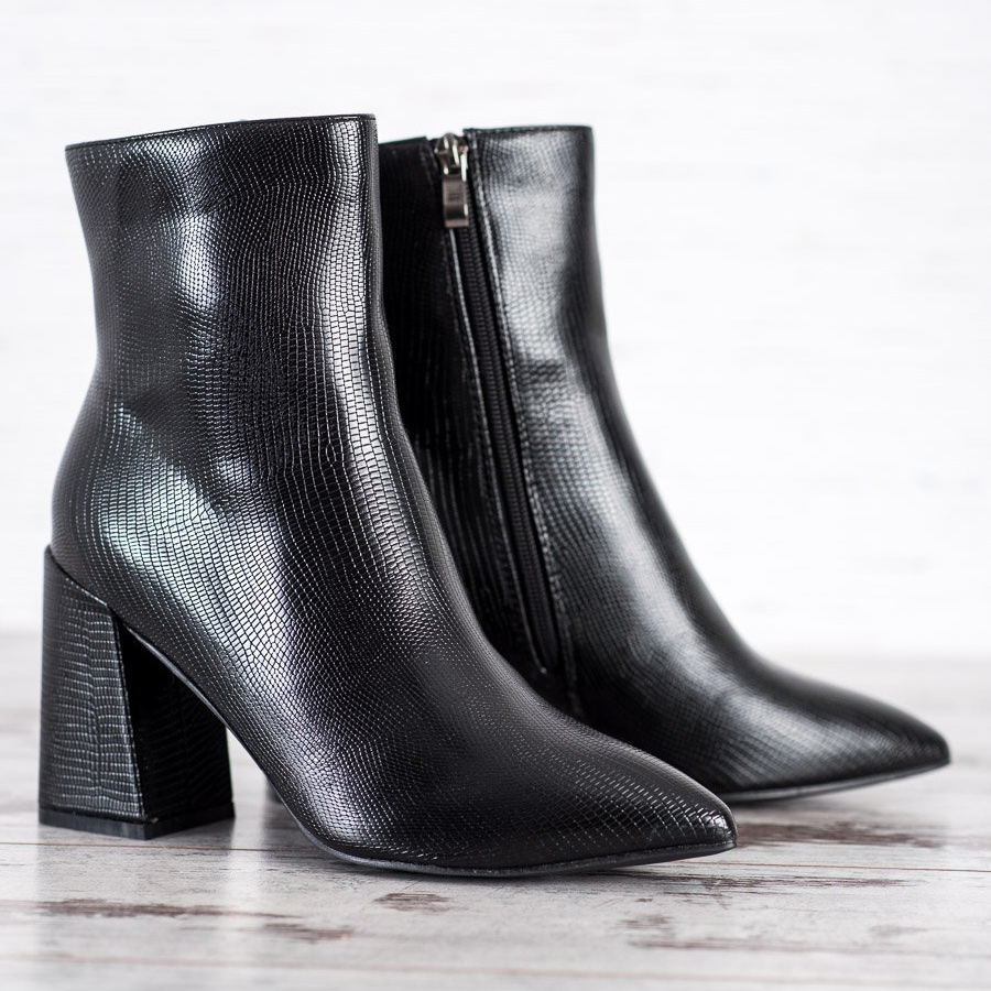 Eine angenehme Innenisolierung sorgt für thermischen Komfort auch an kälteren Tagen und der hohe, 9 cm hohe Blockabsatz betont die Figur schlank und verlängert die Beine optisch. Der Reißverschluss erleichtert das An- und Ausziehen, was die Stiefel äußerst praktisch macht. Die glatte Synthetiksohle und die versteifte Ferse sorgen für Stabilität und Komfort, was im Alltag äußerst wichtig ist.