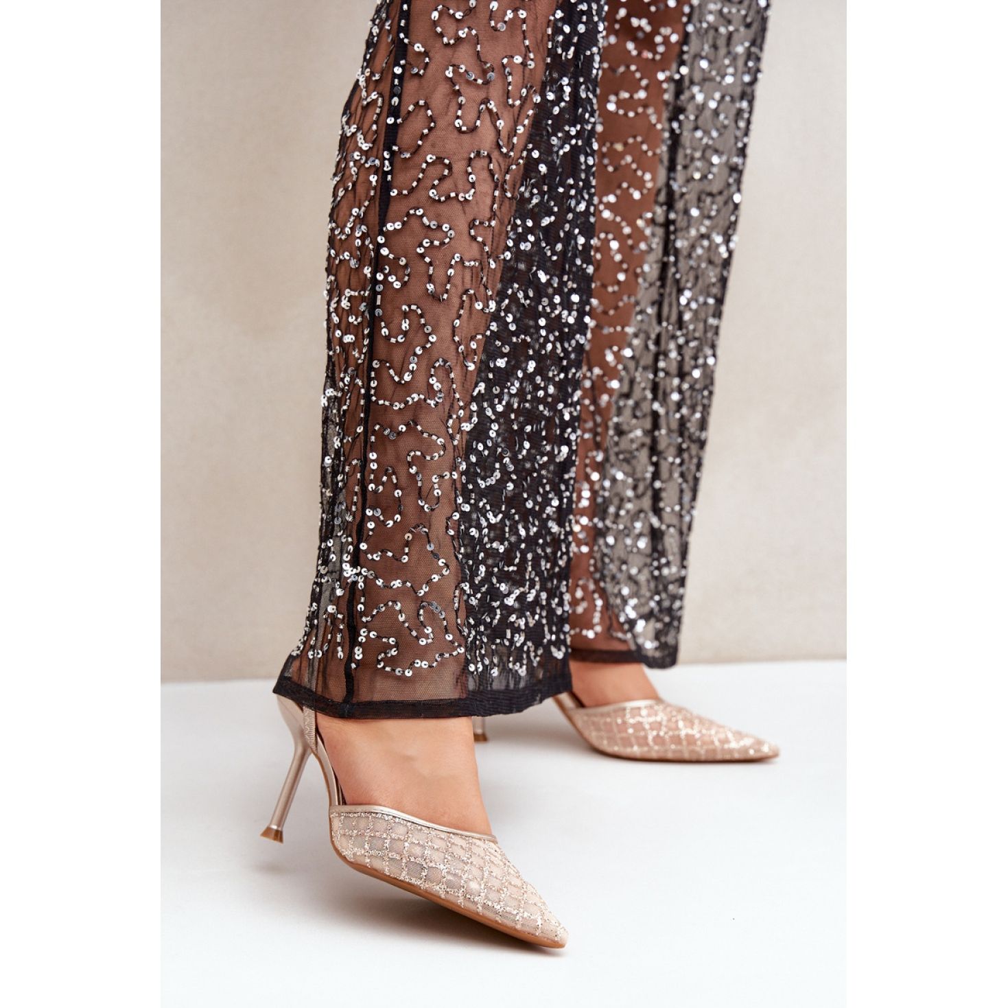 High Heels Berilae B1639-202 in einem Schatten von Golden Brocade ist ein Vorschlag für Frauen, die ihren Aussehen dem Glanz und Stil verleihen wollen. Diese eleganten Schuhe zeichnen sich durch spitze Zehen aus, die die Beine optisch verlängern, und ihre Fersenhöhe von 8,5 cm garantiert einen sinnlichen Effekt. Hergestellt aus Stoff mit Glitzerpartikeln, hohe Absätze reflektieren subtil Licht, was sie zur perfekten Wahl für Abendausflüge, Feierlichkeiten oder Silvesterveranstaltungen macht.