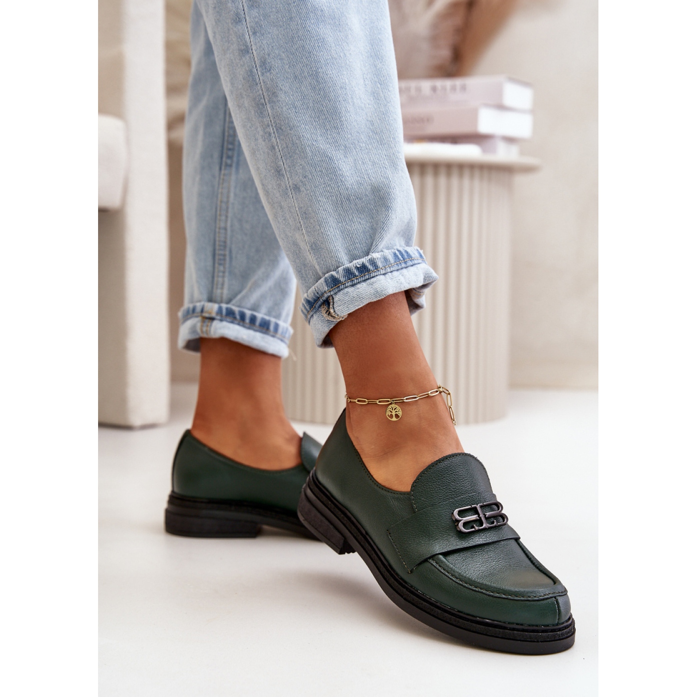 - Modell: Grüne Ledermokassins