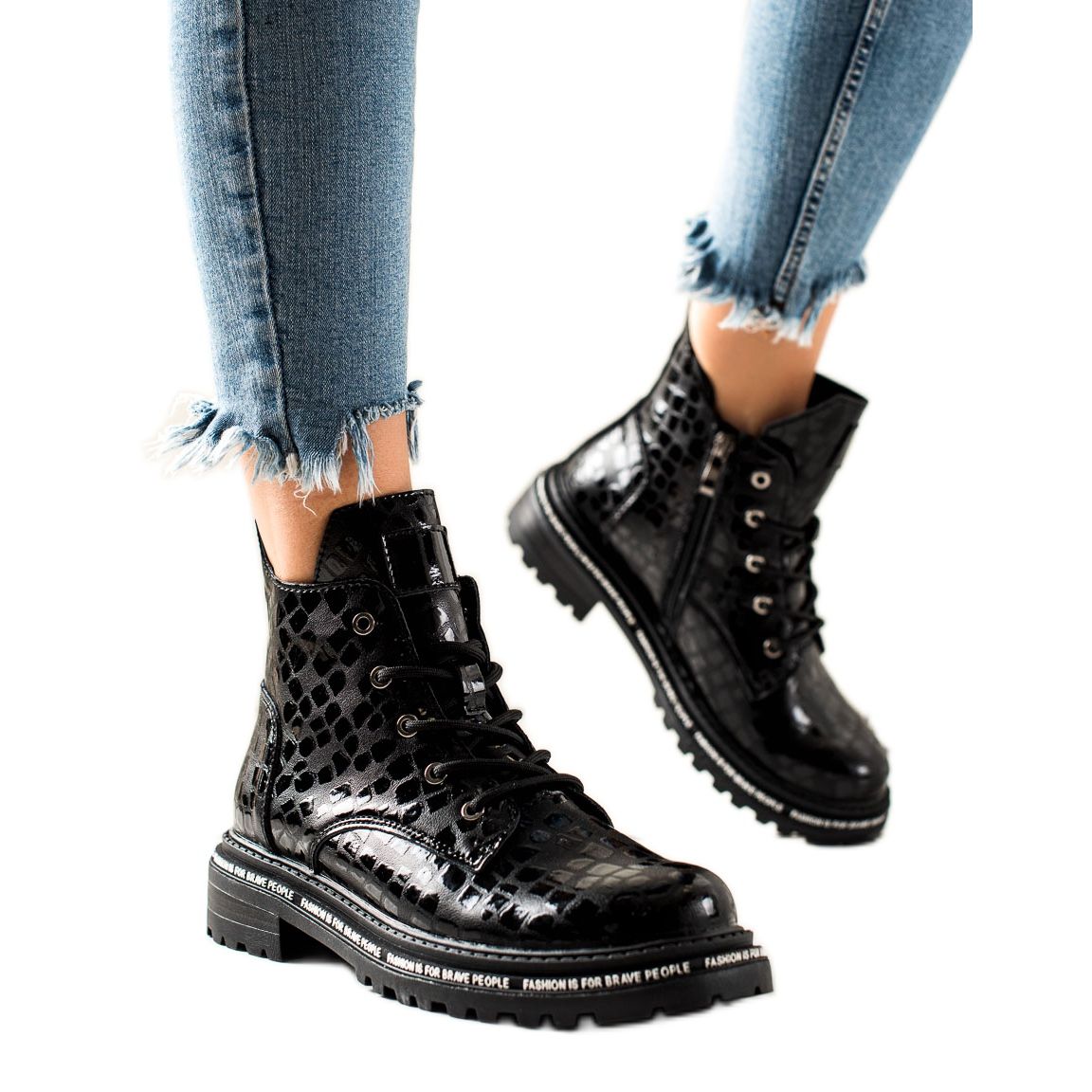 Schwarze Farbe und eine klassische, runde Spitze kombiniert mit einem 4 cm flachen Absatz sorgen für Eleganz und Vielseitigkeit. Die Schafthöhe von 14 cm und die Breite von 20 cm betonen den Knöchel perfekt und machen diese Stiefel zu einer perfekten Wahl für jede Figur. Zusätzliche Elemente wie ein Reißverschluss und eine Schnürung erleichtern das Anziehen und Anpassen an das Bein.