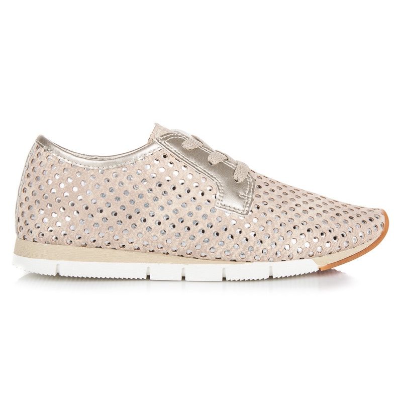 Die Sneaker bestehen aus hochwertigem ökologischem Leder und ihr durchbrochenes Muster verleiht ihnen Originalität und Leichtigkeit. Durch die Farben – eine harmonische Kombination aus Gelb, Gold, Braun und Beige – passen sie zu vielen verschiedenen Outfits. Die Innenseite der Schuhe ist mit weichem Stoff gefüttert, was auch bei längerem Tragen für Komfort sorgt.