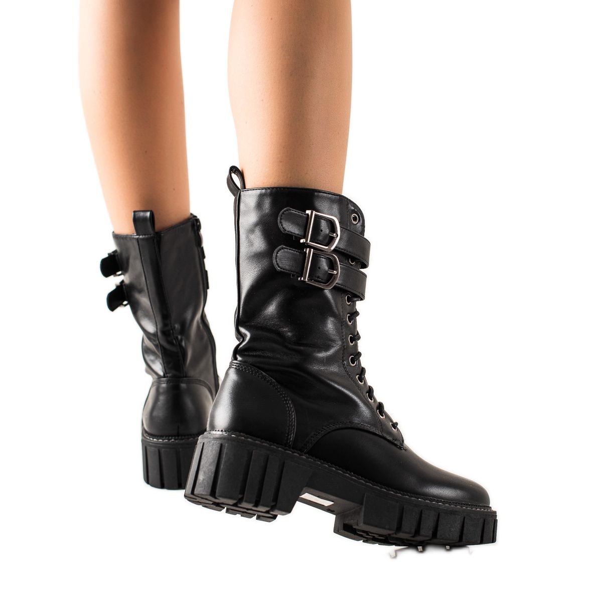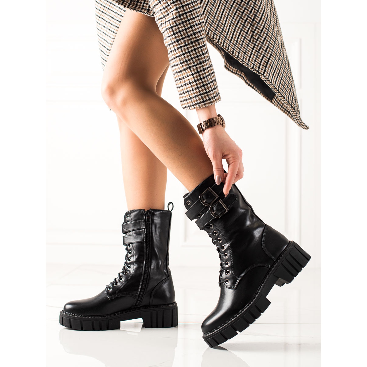 Schwarze Arbeiterstiefel zeichnen sich durch eine dekorative Schnalle aus, die ihnen Charakter verleiht und sie zu einer attraktiven Ergänzung zu jedem Outfit macht. Dank des hohen, bis über den Knöchel reichenden Schafts und des 3 cm hohen Plateaus sind sie eine hervorragende Wahl für kältere Tage.