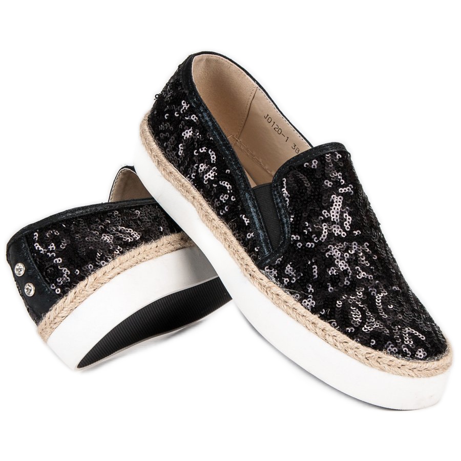 Wir präsentieren modische Damen-Sneaker von J. Star in elegantem Schwarz, die sportlichen Komfort mit sinnlicher Mädchenhaftigkeit perfekt vereinen. Diese einzigartigen Schuhe, verziert mit glänzenden Pailletten und Strasssteinen, ziehen die Blicke auf sich und verleihen jedem Styling Charakter.