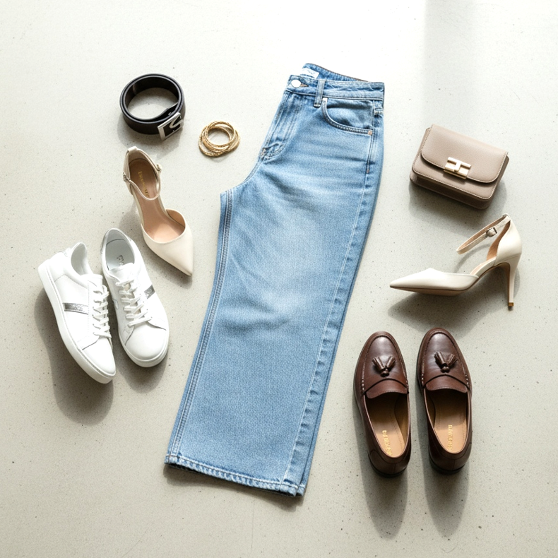 Weite Jeans und Straight-Leg-Schnitte gehören zu den Top-Styles im Jahr 2026. Ein lockereres Bein erfordert passende Schuhe, um die Figur im Gleichgewicht zu halten. Wichtigste Regel: Die Schuhspitze muss sichtbar sein – egal wie lang das Bein ist.