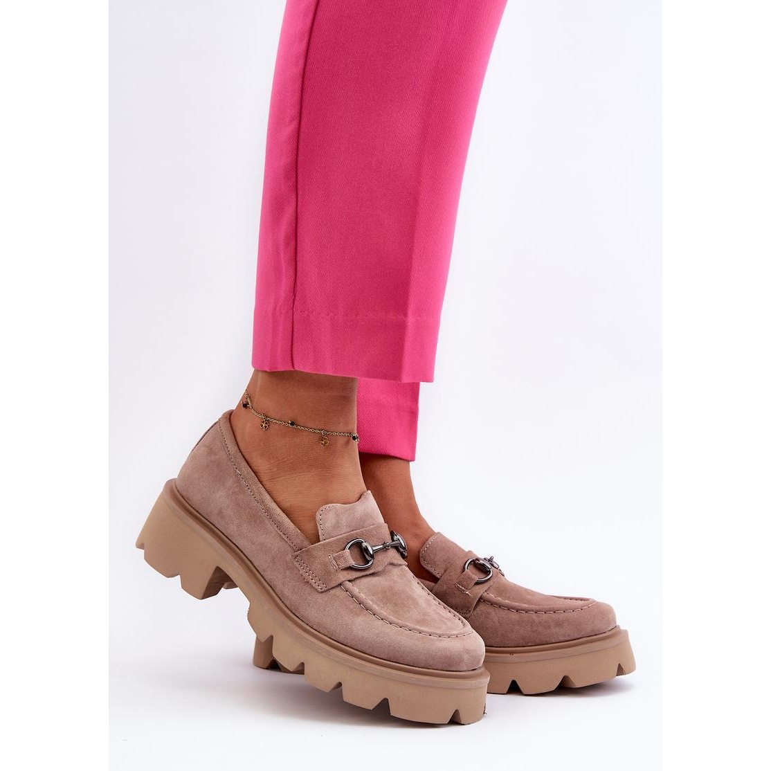 Das Modell ist durch eine runde Nase gekennzeichnet, die ihm Delikatesse und Eleganz verleiht. Der Innenraum des Schuhs ist mit natürliches Leder gepolstert, wodurch sich die Füße den ganzen Tag in ihnen wohl fühlen. Die beige Farbe dieser Mokassins fügt sich perfekt mit verschiedenen Stilen ein - sowohl lässiger als auch formaler.