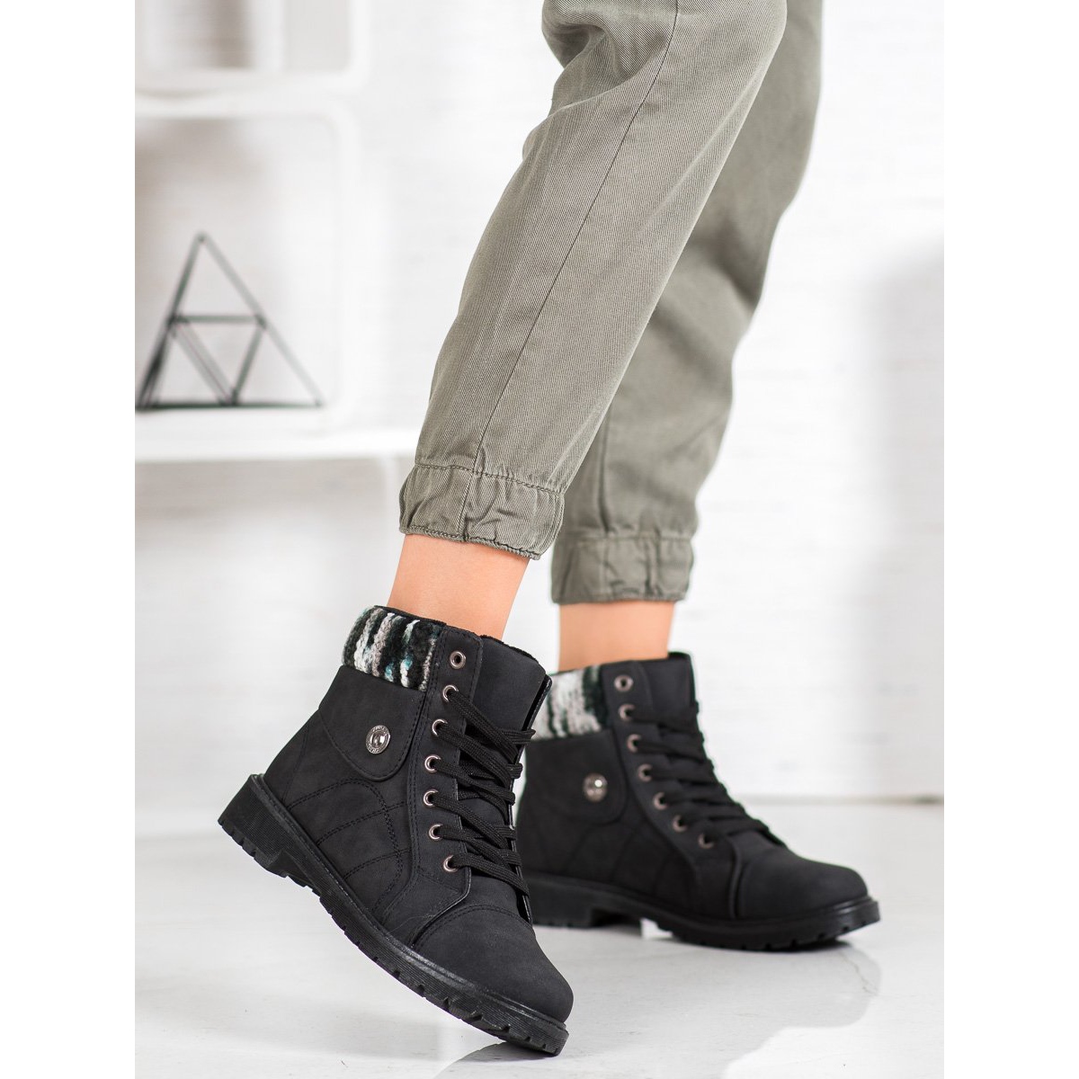 Trapperstiefel reichen bis über den Knöchel, was ihren modischen Charakter zusätzlich unterstreicht. Ihre Schnürung ermöglicht eine perfekte Anpassung an den Fuß, was für Stabilität und Komfort bei alltäglichen Aktivitäten sorgt. Ein breiter 3 cm hoher Absatz macht auch lange Spaziergänge zum Vergnügen.