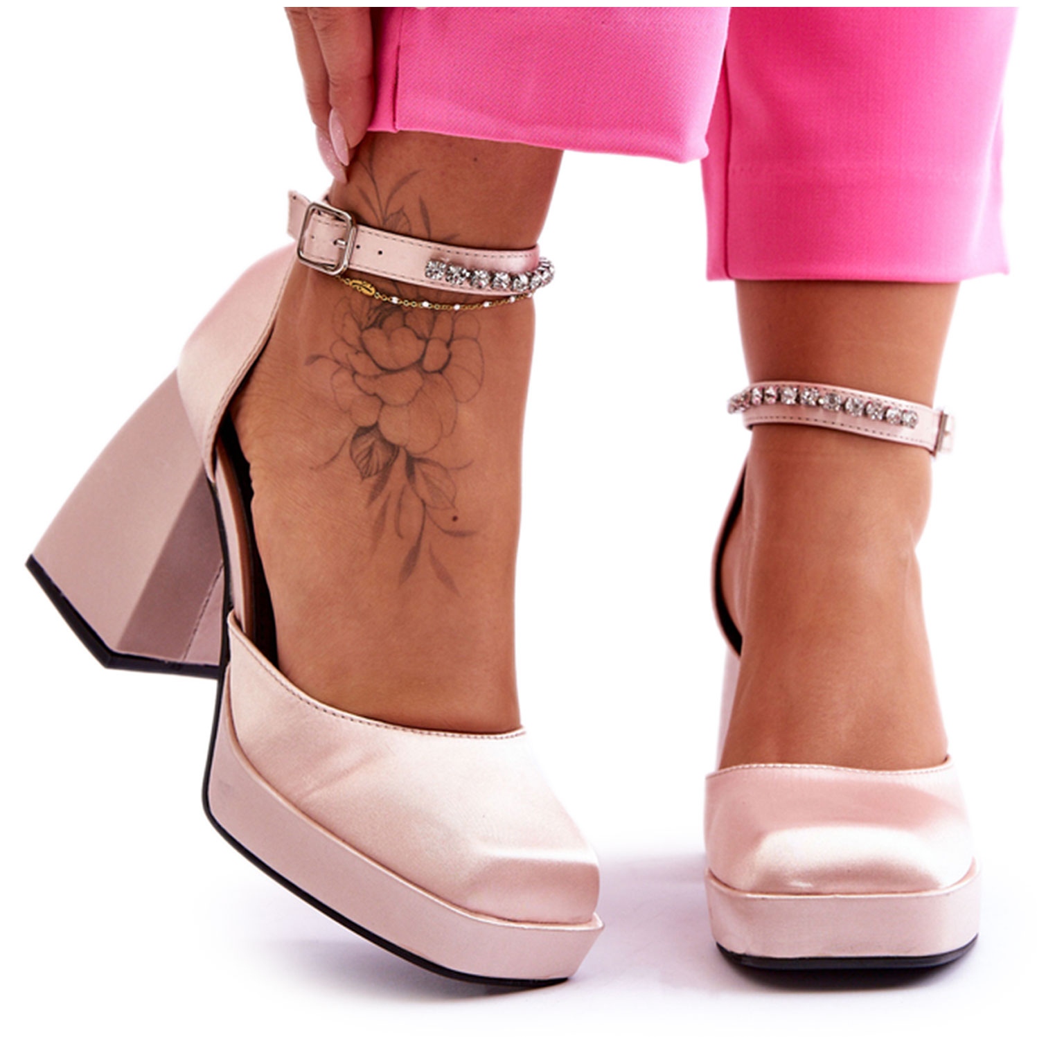 Die versteifte Ferse garantiert eine gute Fußstabilisierung, was beim Tragen von High Heels wichtig ist. Modische Pumps mit massivem Absatz und Strasssteinen eignen sich für viele Stilrichtungen, von formell über Business bis hin zu Abendausflügen.
