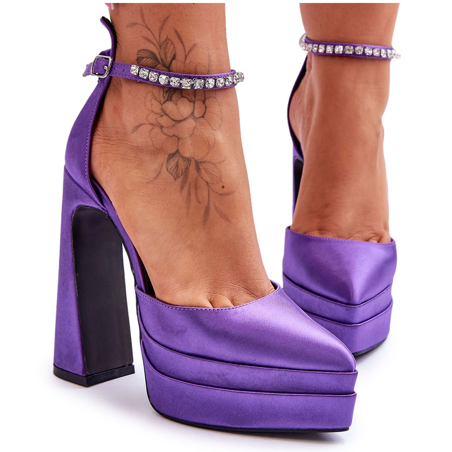 Die spitze Spitze verleiht den Schuhen nicht nur ein klassisches und formschönes Profil, sondern spiegelt auch die neuesten Trends der Schuhmode wider. Die Pumps sind mit einem eleganten, mit Zirkonen verzierten Riemen ausgestattet, der dem Ganzen einen dezenten Glanz verleiht und den exklusiven Charakter des Modells unterstreicht. Die Schnalle sorgt nicht nur für einen bequemen Verschluss, sondern ermöglicht auch eine einfache Anpassung, wodurch sich die Schuhe perfekt an den Fuß anpassen.