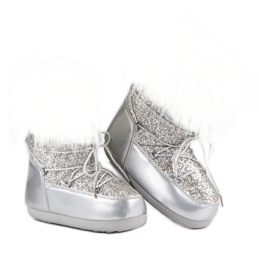 Die Schneestiefel zeichnen sich durch ihr beeindruckendes silbernes Glitzer-Finish aus, das Aufmerksamkeit erregt und für Glanz sorgt. Ein zusätzlicher Vorteil ist das weiche Fell, das an kälteren Tagen für Komfort und Wärme sorgt. Ohne dekorative Muster behalten diese Schuhe einen minimalistischen und dennoch stilvollen Charakter.