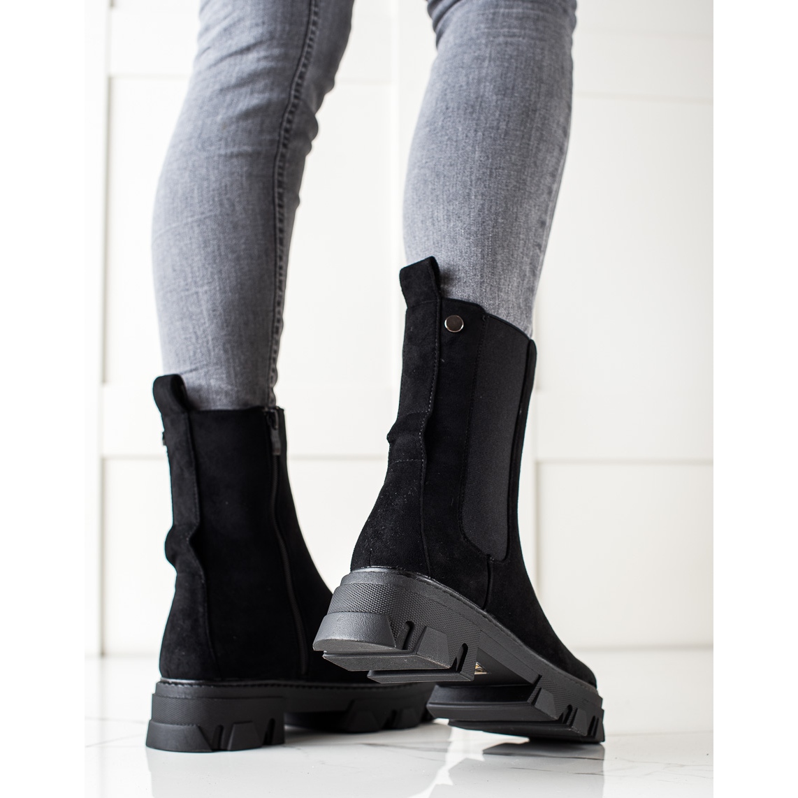 Diese eleganten schwarzen Stiefel zeichnen sich durch einen integrierten, weichen Absatz aus, der nicht nur für Tragekomfort, sondern auch für eine perfekte Passform am Fuß sorgt. Sie bestehen aus Wildlederimitat und sehen stilvoll aus. Dank ihres minimalistischen Designs lassen sie sich leicht mit verschiedenen Freizeitstilen kombinieren.