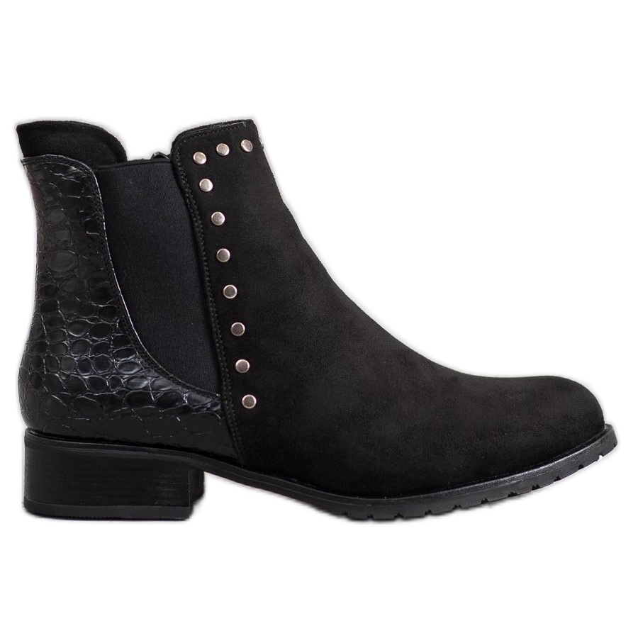 Hier ist die perfekte Wahl für jede Frau, die Mode mit Komfort verbinden möchte – die modischen schwarzen SHELOVET-Stiefeletten. Diese originellen Stiefeletten sind eine perfekte Ergänzung zu vielen Alltagsstilen und sorgen gleichzeitig für Tragekomfort. Das mit silbernen Strasssteinen verzierte Obermaterial aus wildlederähnlichem Material zieht die Blicke auf sich und verleiht den Schuhen einen einzigartigen Charakter. Die Rückseite der Stiefel mit Krokodilledermotiv verleiht einen Hauch von Eleganz und Stil.