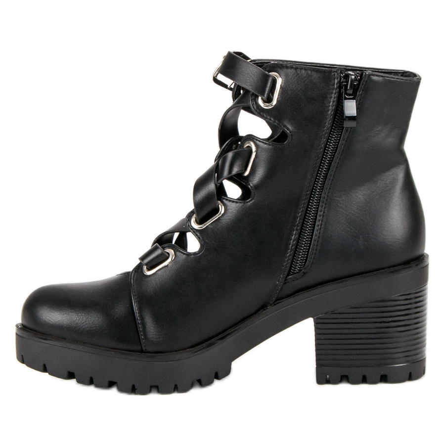 Die Stiefel haben einen hohen Schaft, der an kälteren Tagen für zusätzliche Wärme sorgt, der Tragekomfort wird durch Textileinsätze erhöht. Eine ungewöhnliche Schnürung und ein dickerer Blockabsatz verleihen dem Schuhwerk einen räuberischen und rockigen Stil, perfekt für mutige Frauen. Die runde Spitze sorgt für Subtilität und macht diese Schuhe nicht nur stilvoll, sondern auch bequem.