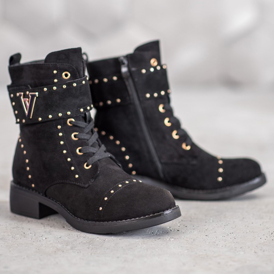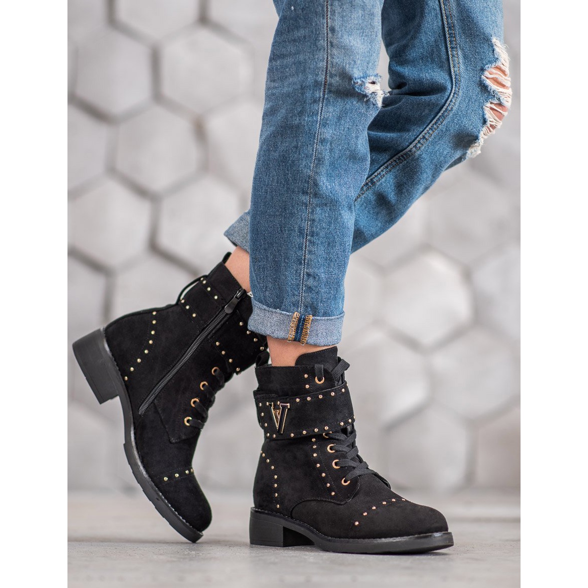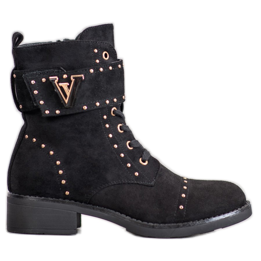 Diese eleganten Damenstiefeletten sind präzise aus hochwertigem schwarzen lederähnlichen Material gefertigt, das Wildleder imitiert. Ästhetik und Details gehen Hand in Hand mit Funktionalität – auf der Oberfläche der Schuhe lenken modische goldene Strasssteine die Aufmerksamkeit auf sich, die in einem interessanten Muster angeordnet sind und jedem Styling Charakter verleihen.