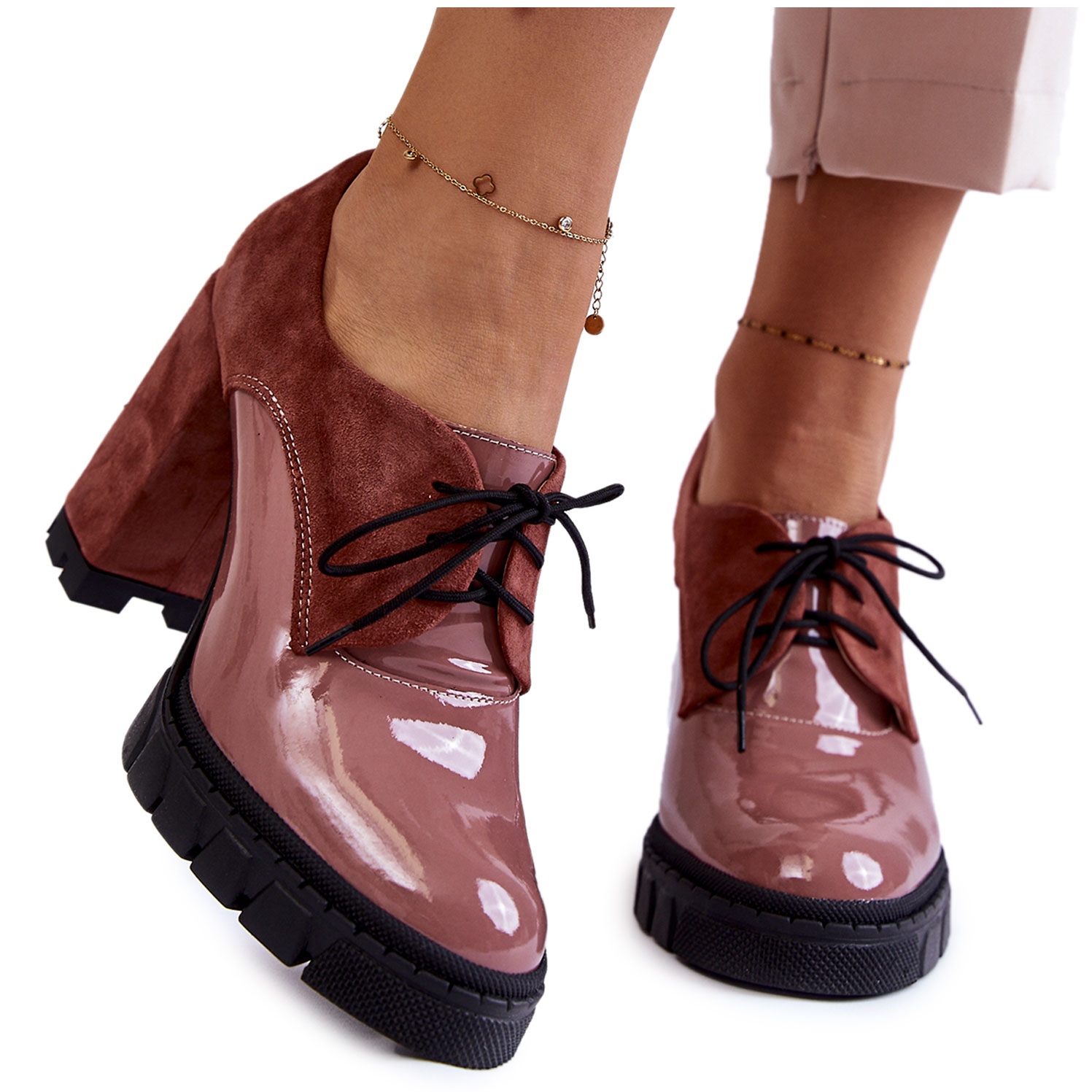 Mit einem 10 cm hohen Blockabsatz und einem 2,5 cm hohen Plateau sind diese Stiefeletten die perfekte Wahl für jede Fashionista. Die weiche Innensohle aus Naturleder macht das Laufen zum reinen Vergnügen. Dank der originellen Kombination aus Wildleder und Lack werden diese Stiefel mit Sicherheit alle Blicke auf sich ziehen und jedes Styling ergänzen.