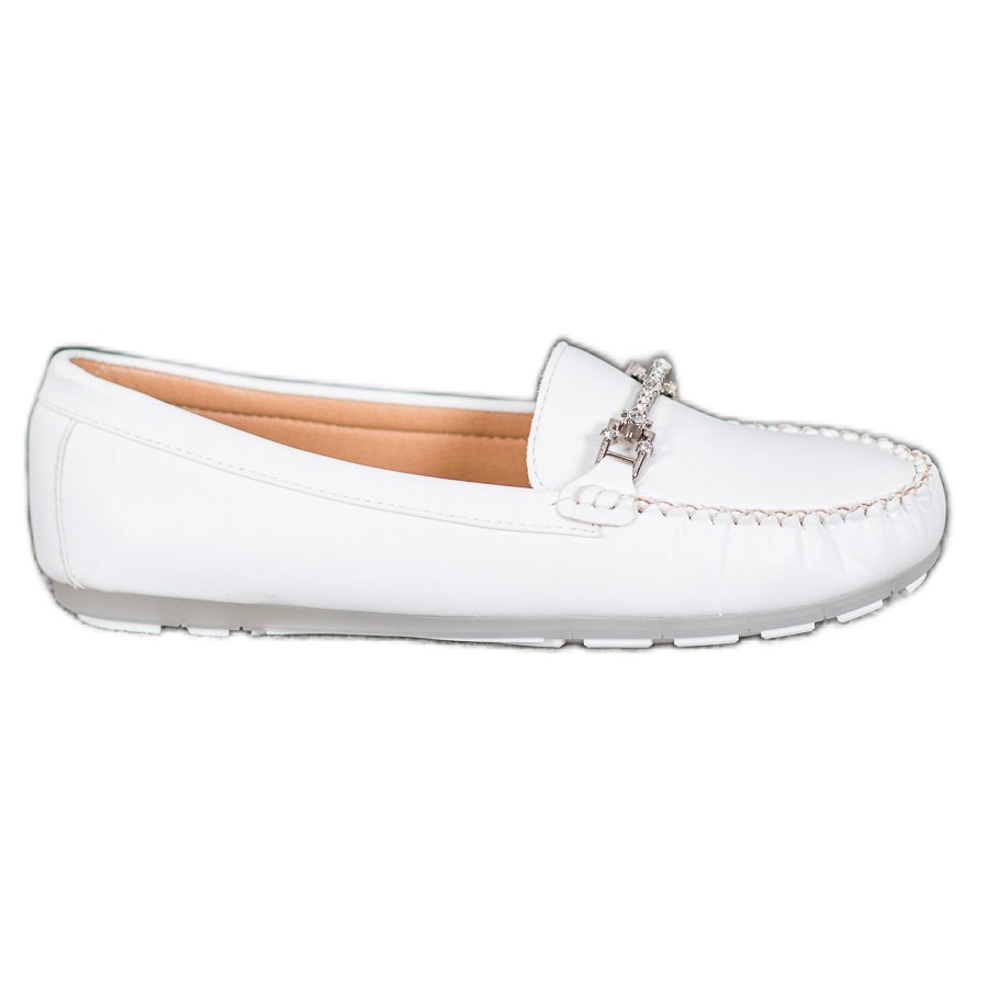 Die Mokassins bestehen aus hochwertigem lederähnlichem Material, das nicht nur für ein ansprechendes Aussehen, sondern auch für Tragekomfort sorgt. Die gesamte Oberfläche des Obermaterials in elegantem Weiß hebt sich von anderen Modellen ab. Abgerundete Spitzen und gerüschte Verbindungen sorgen für dezenten Charme und die silberne Schnalle mit Zirkonen verleiht dem Ganzen einen einzigartigen Glanz.