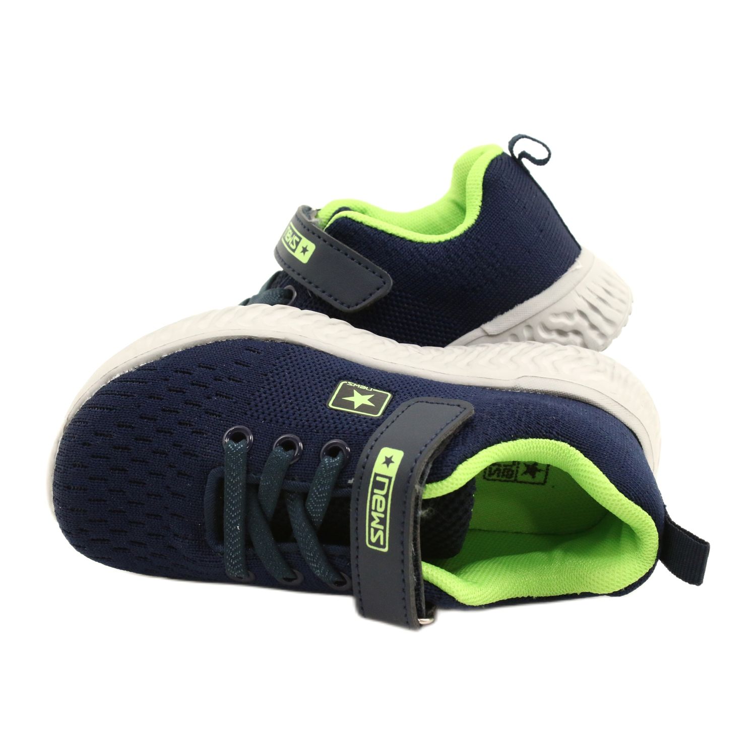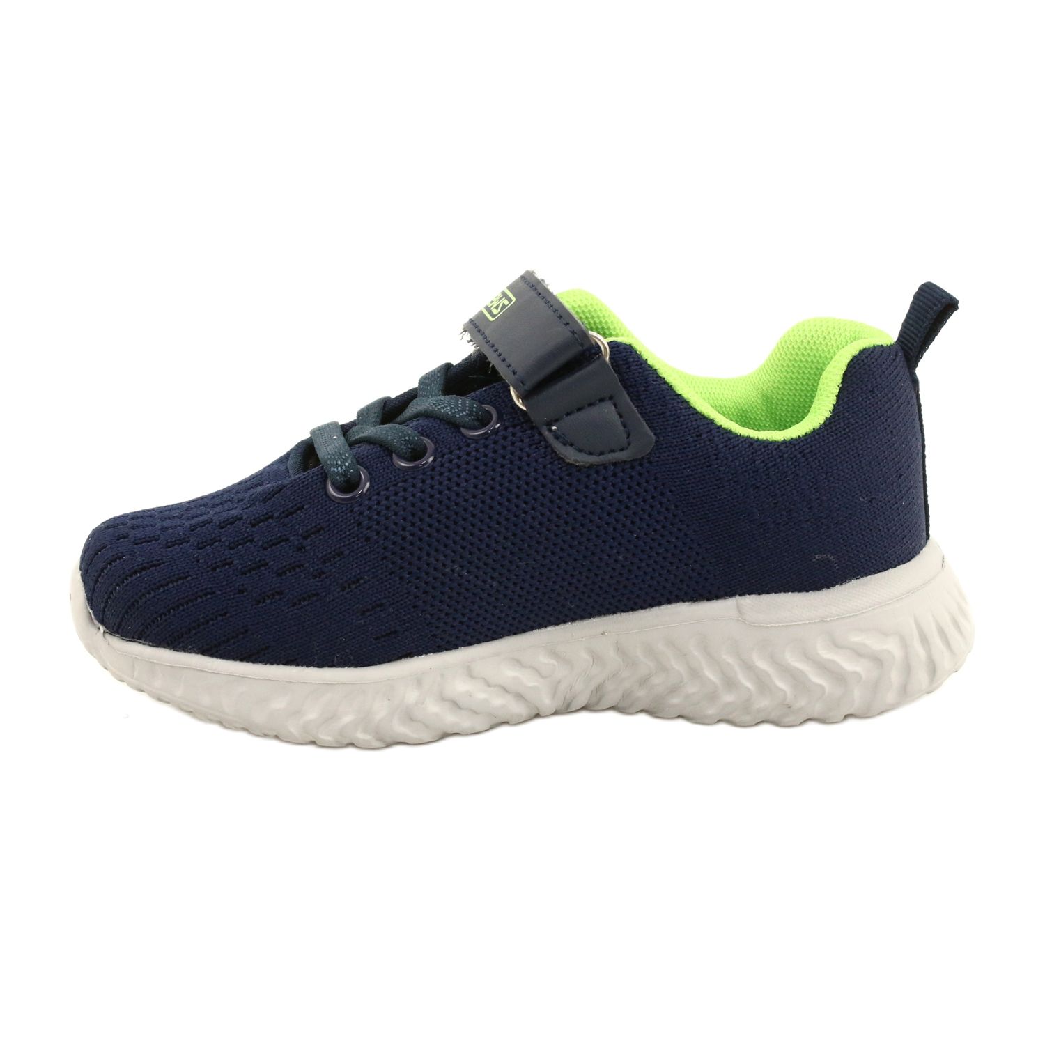 Praktische und stilvolle Nachrichten Kinderschuhe, die für den täglichen Gebrauch konzipiert sind. Sie bestehen aus dauerhaftem Textilmaterial und kombinieren Komfort mit ästhetischem, modernem Design. Die universellen blaublauen Farben der Marine mit einem grünen Interieur werden sowohl Jungen als auch Mädchen ansprechen.
