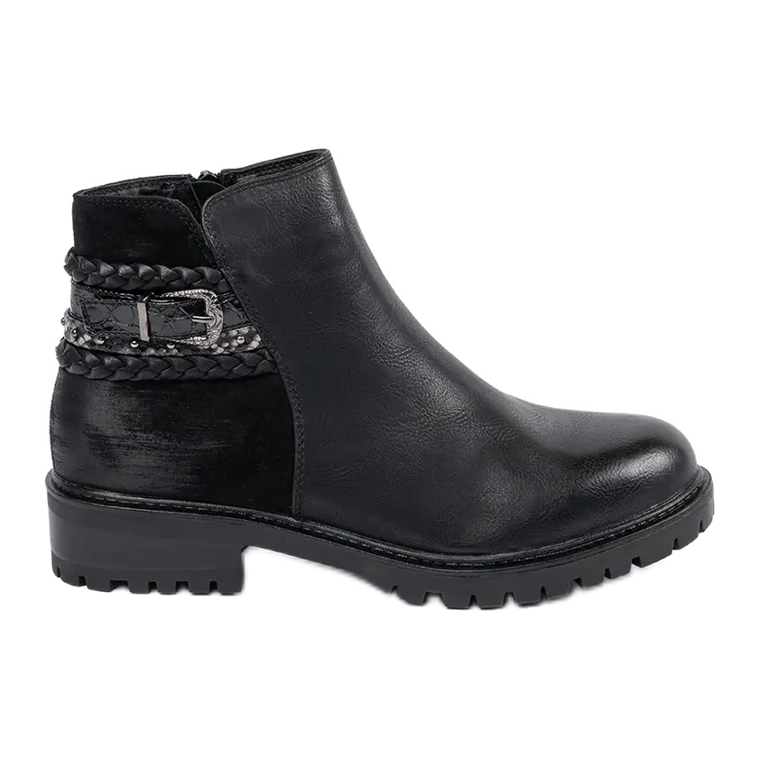 Der Schaft des Modells reicht bis über den Knöchel und der Reißverschluss erleichtert das Anziehen. Zierriemen mit Zierschnalle verleihen ihnen einen rockigen Charakter und die Form sorgt für Stabilität durch einen breiten 4 cm hohen Absatz und eine Sohle mit Protektor, die Halt garantiert.