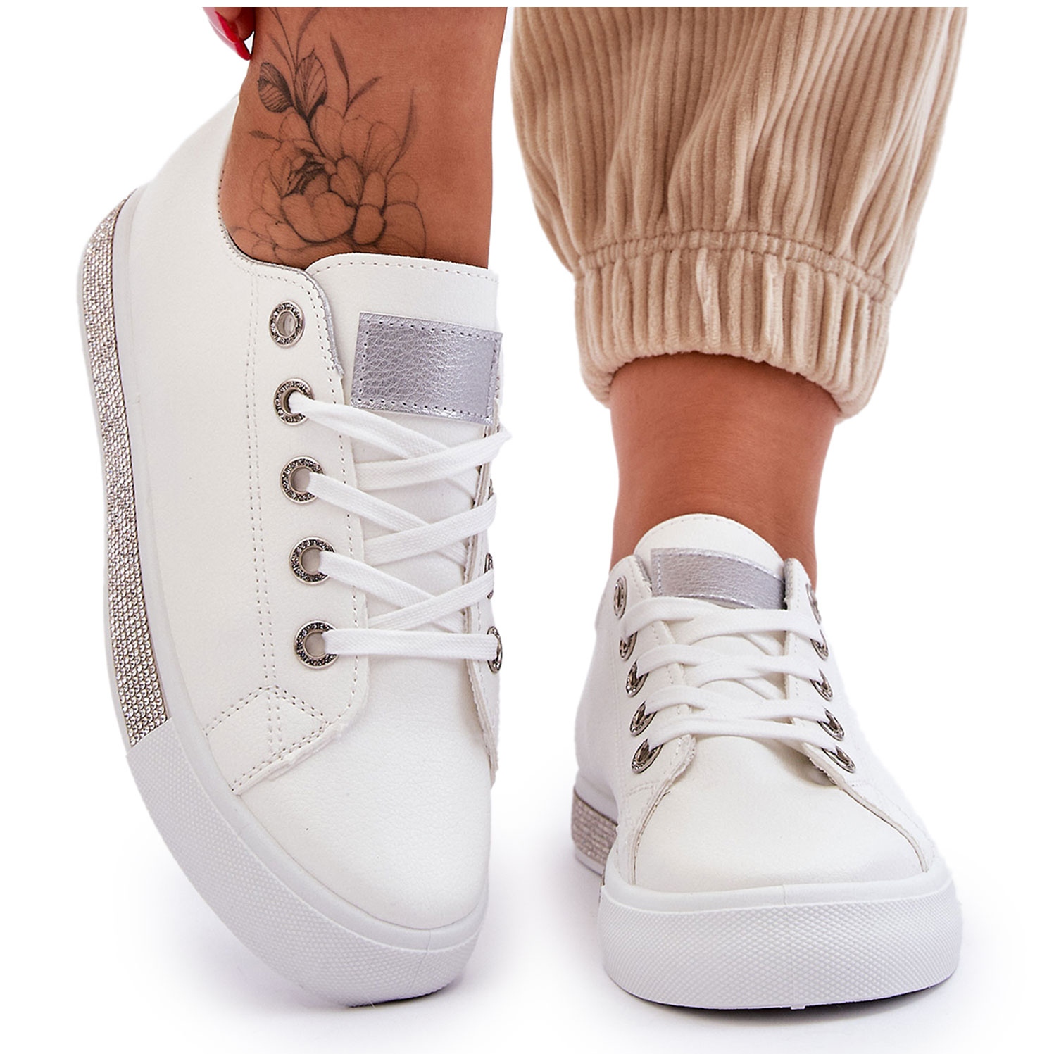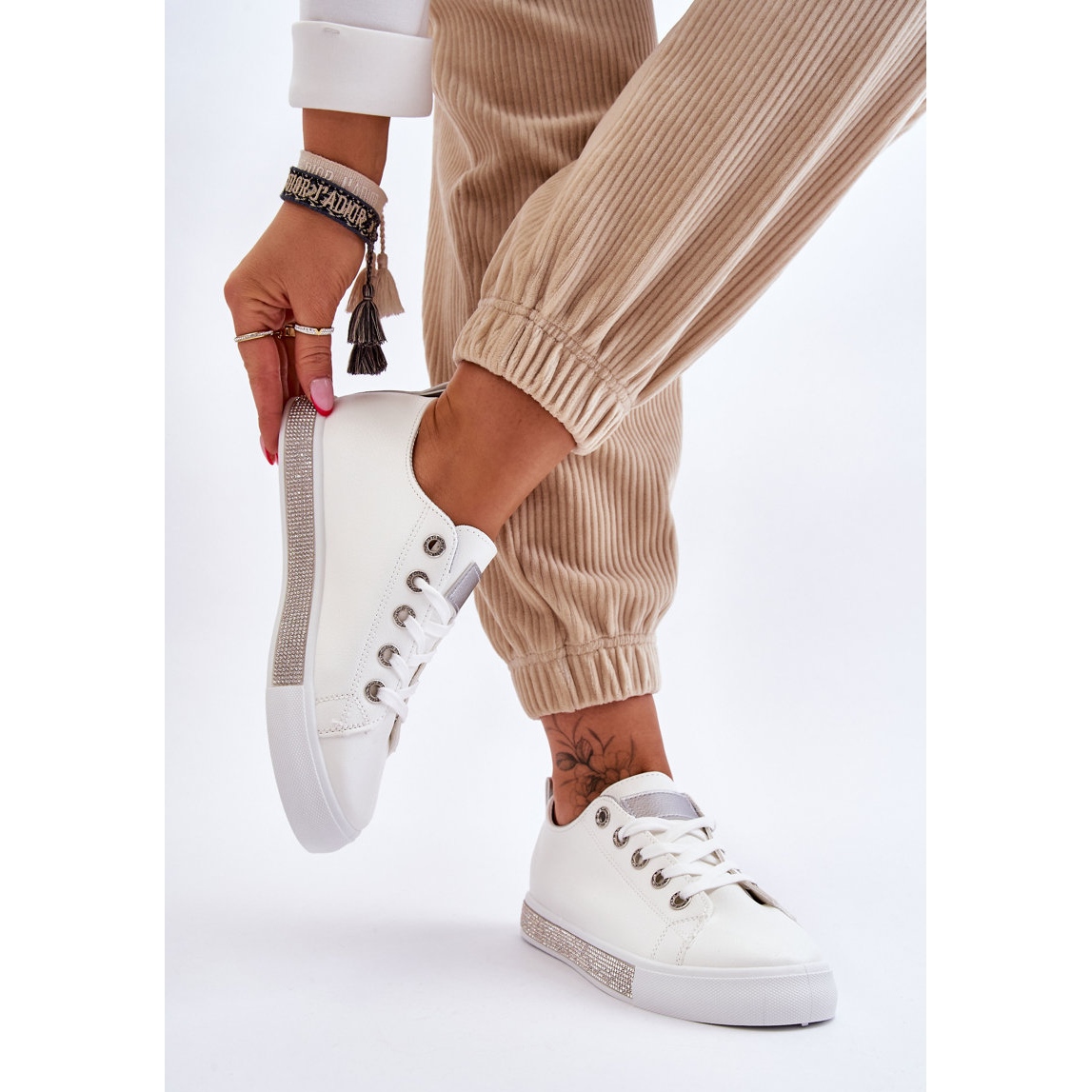 Die weißen und silbernen Damen-Sneaker PS1 mit Strasssteinen von Demira sind ein Klassiker in einer modernen Version, der Liebhaber eines lässigen Stils mit etwas Chic ansprechen wird. Die weiße Farbe des Schuhwerks, kombiniert mit glänzenden silbernen Details in Form von Strasssteinen, zieht die Blicke auf sich und verleiht selbst dem einfachsten Alltags-Styling Glanz.
