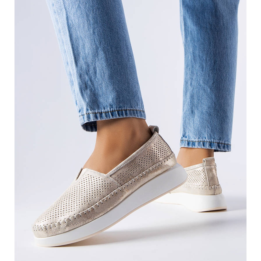 Elegante und bequeme Noruega -Schuhe in einem spektakulären, goldenen Farbton. Sie bestehen aus glänzendem, natürlichen Openwork -Leder und kombinieren Eleganz mit einem urbanen Charakter - ideal für Sommerstilisierungen, wenn Sie den Stil des Stils betonen und den ganzen Tag über den Komfort sicherstellen möchten.