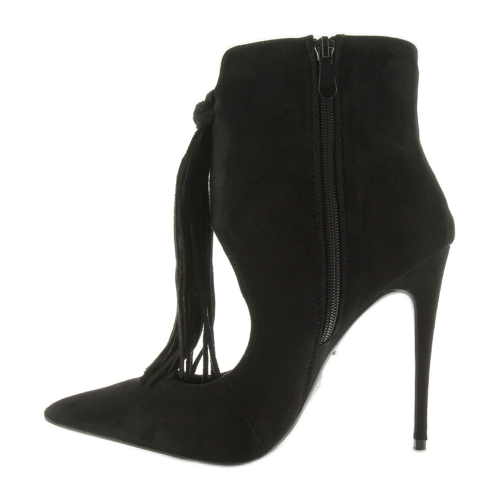 Offene Stiefeletten mit Fransen 5035 Black sind die perfekte Wahl für Frauen, die Wert auf Eleganz und einzigartigen Stil legen. Diese originellen Stiefeletten mit schmalem 11,5 cm hohem Absatz verleihen jedem Styling einen einzigartigen Charakter. Sie bestehen aus fleischigem Öko-Wildleder und sehen dank des Ausschnitts auf Höhe des Spanns und der dekorativen Fransen, die ihr einzigartiges Aussehen betonen, äußerst attraktiv aus.