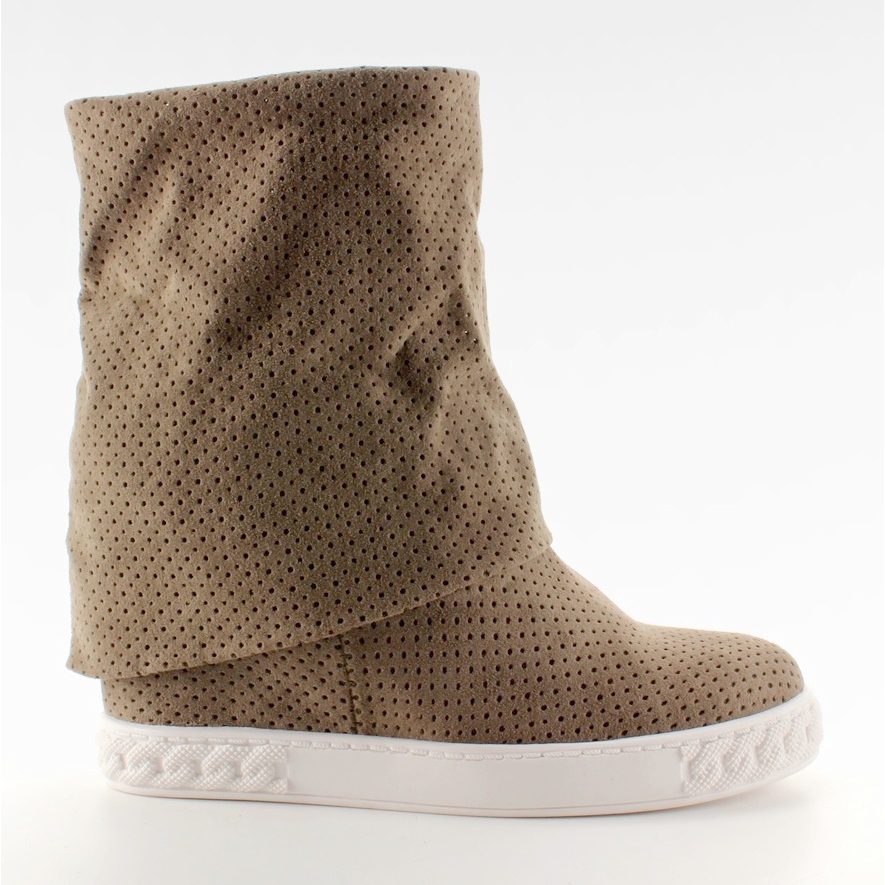 Stilvolle Damenstiefeletten mit verstecktem Keilabsatz, die Leichtigkeit und Eleganz vereinen. Hergestellt aus ökologischem Wildleder in durchbrochener Form, mit weichem, gerolltem Obermaterial. Der versteckte 8-cm-Absatz formt die Figur perfekt und sorgt gleichzeitig für Tragekomfort.