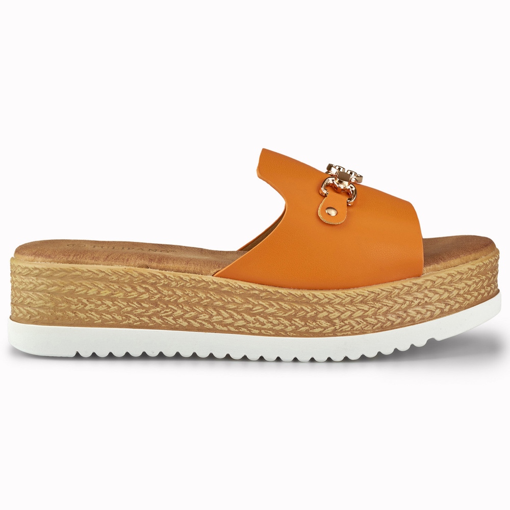 Details: Orangefarbene Damenhausschuhe mit niedrigem Keilabsatz
